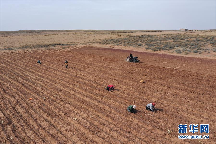 4月15日,農(nóng)民在杭錦旗道勞呼都格嘎查的農(nóng)田里勞作(無人機(jī)照片)。春種時節(jié),在內(nèi)蒙古鄂爾多斯市杭錦旗道勞呼都格嘎查,農(nóng)民忙著播種紅蔥。在鄂爾多斯高原種植的紅蔥耐旱耐寒,具有較好的經(jīng)濟(jì)效益。新華社記者徐欽攝