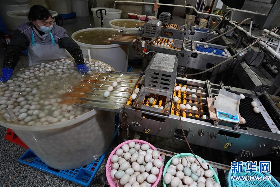 江蘇高郵鴨集團的工作人員在生產車間內清洗分揀鴨蛋(4月15日攝)。“高郵鴨蛋”是江蘇高郵的特色農業(yè)名片。近年來,當?shù)卦诹挤N繁育、生態(tài)養(yǎng)殖、產品加工等方面加大力度,推動高郵鴨蛋品牌化建設,讓小鴨蛋成為帶動農戶致富的大產業(yè)。2019年,高郵市共計生產熟制鴨蛋產品近11.2億枚,年產值近17.68億元。新華社記者韓瑜慶攝