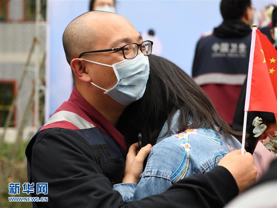 4月21日,在四川大學(xué)華西醫(yī)院,醫(yī)療隊(duì)隊(duì)員相互擁抱。當(dāng)日,來(lái)自四川大學(xué)華西醫(yī)院、華西第二醫(yī)院、華西第四醫(yī)院的醫(yī)療隊(duì)隊(duì)員解除隔離休整,與分別許久的家人、同事團(tuán)聚,緊緊相擁。新華社記者王曦?cái)z