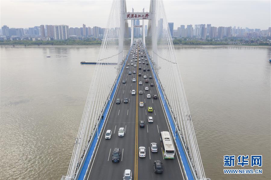 4月14日,武漢長江二橋上車流如織(無人機(jī)照片)。新華社記者才揚(yáng)攝