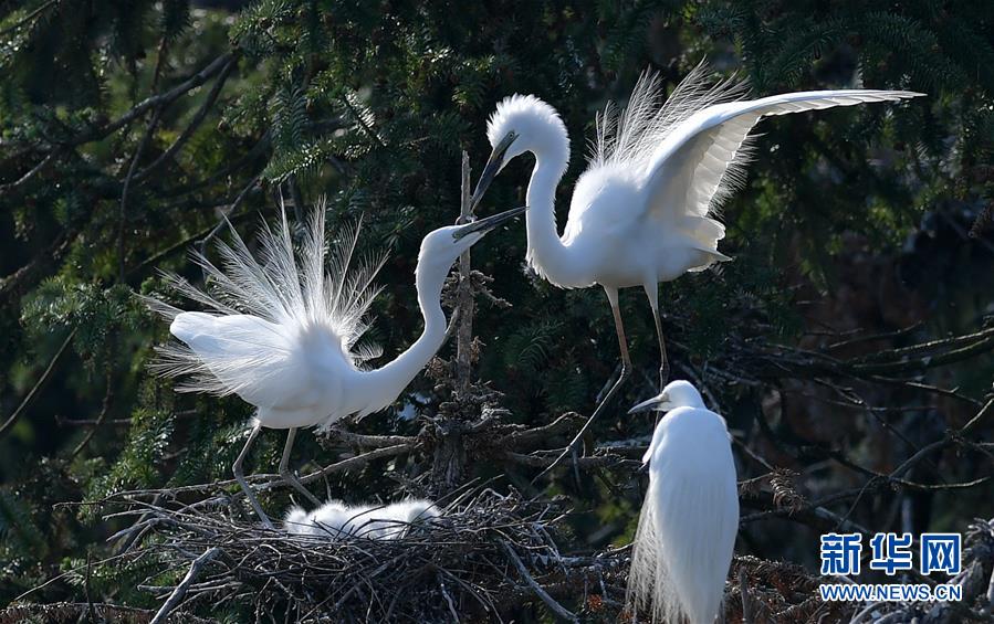 白鷺在象山森林公園嬉戲(4月26日攝)。近日,在江西省南昌市新建區(qū)象山森林公園內(nèi),已安家筑巢的大批鷺鳥正陸續(xù)孵化后代,一派生機勃勃的景象。新華社記者彭昭之攝