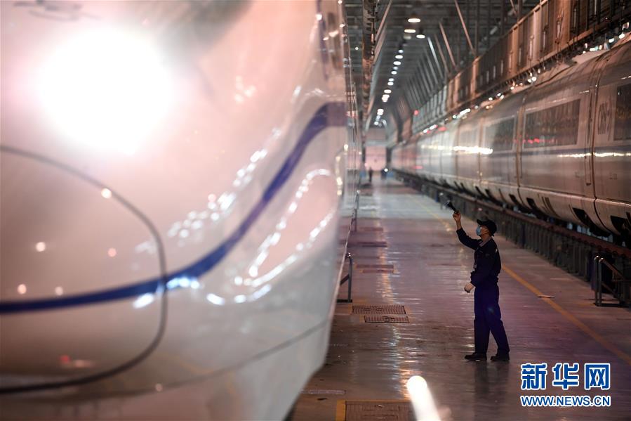 4月29日夜,合肥南動車運(yùn)用所的工作人員對動車組進(jìn)行檢修。每當(dāng)夜深人靜的時候,合肥南動車運(yùn)用所卻燈火通明,“動車安全守護(hù)者”們堅守崗位,對動車組進(jìn)行全面細(xì)致檢修。新華社記者 劉軍喜 攝