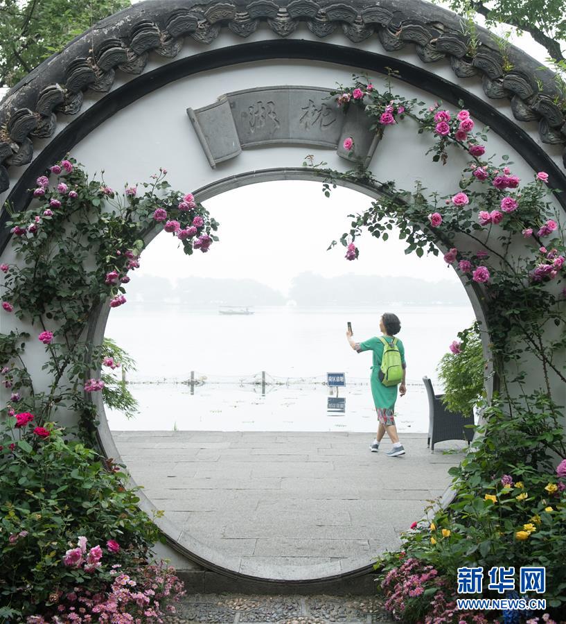 5月5日,游客在西湖畔的郭莊觀看月季花展?!拔逡弧逼陂g,第八屆杭州西湖月季花精品展在杭州西子湖畔舉行,展出國內(nèi)外700余個月季品種。新華社記者翁忻旸攝