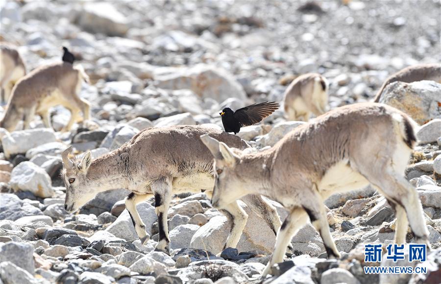 一群巖羊在珠峰大本營附近覓食(5月8日攝)。當日,一群巖羊在珠峰大本營周圍覓食,黃嘴山鴉飛到巖羊身上停留,構(gòu)成一幅幅生動有趣的雪域圖畫。新華社記者晉美多吉攝