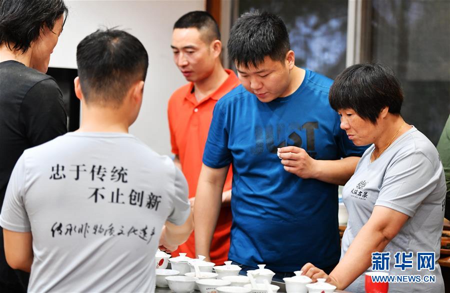 游玉瓊(右一)帶著兒子方舟(右二)和公司制茶師傅們一起審評毛茶(5月9日攝)。新華社記者魏培全攝