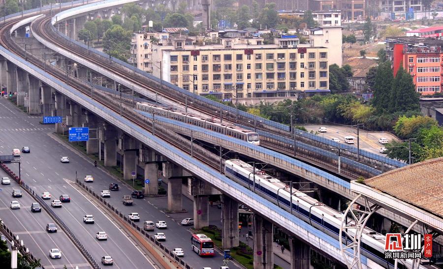 2020年5月11日,四川省成都市,犀浦站是全國(guó)首個(gè)鐵路與地鐵換乘車站。圖為動(dòng)車、地鐵同時(shí)運(yùn)行在線路上。
