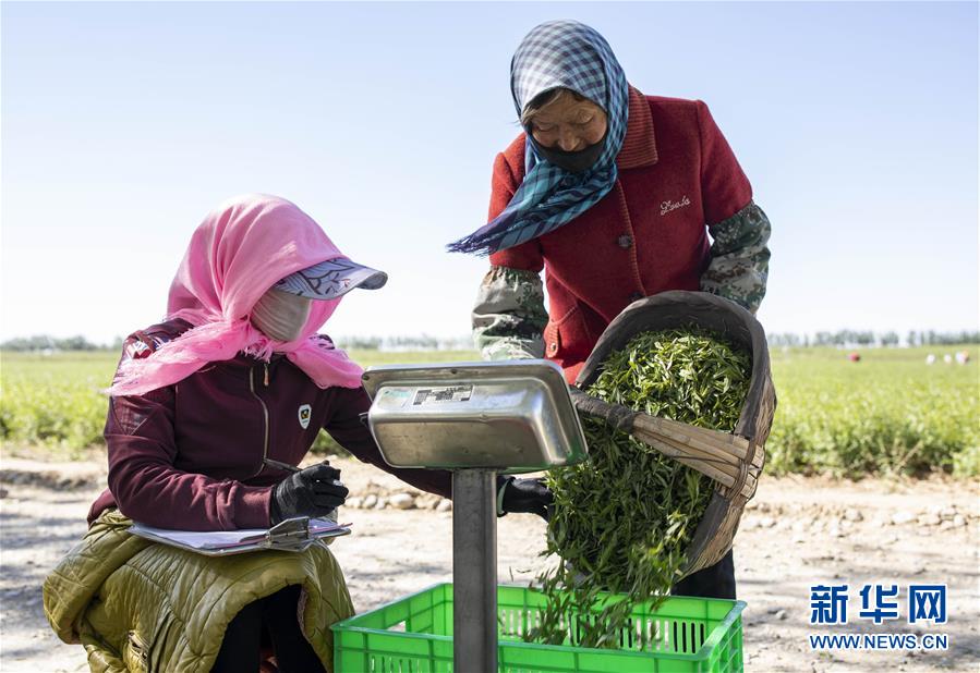 5月11日,在寧夏百瑞源賀蘭山基地,工作人員對采摘的枸杞芽茶進行稱重。當日,寧夏百瑞源賀蘭山基地枸杞芽茶全面進入采摘季。據(jù)了解,該基地茶園面積300余畝,助力附近200多名農(nóng)民就業(yè)增收。新華社記者楊植森攝