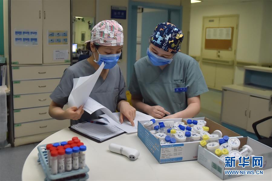 5月11日,在北京地壇醫(yī)院感染二科護(hù)士站,護(hù)士王蕊(左)和石淼在整理病人的核酸樣本。北京地壇醫(yī)院是北京市收治新冠肺炎患者的定點(diǎn)醫(yī)院之一,醫(yī)院的醫(yī)護(hù)人員一直奮戰(zhàn)在抗擊疫情的一線(xiàn)。在國(guó)際護(hù)士節(jié)前夕,記者前往北京地壇醫(yī)院,記錄下抗疫一線(xiàn)護(hù)士的日常工作狀態(tài)。新華社記者彭子洋攝