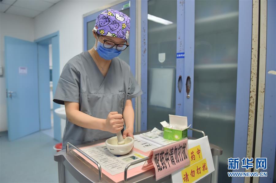 5月11日,在北京地壇醫(yī)院感染二科護(hù)士站,護(hù)士王蕊為不方便服藥的病人研磨藥片。北京地壇醫(yī)院是北京市收治新冠肺炎患者的定點(diǎn)醫(yī)院之一,醫(yī)院的醫(yī)護(hù)人員一直奮戰(zhàn)在抗擊疫情的一線(xiàn)。在國(guó)際護(hù)士節(jié)前夕,記者前往北京地壇醫(yī)院,記錄下抗疫一線(xiàn)護(hù)士的日常工作狀態(tài)。新華社記者彭子洋攝