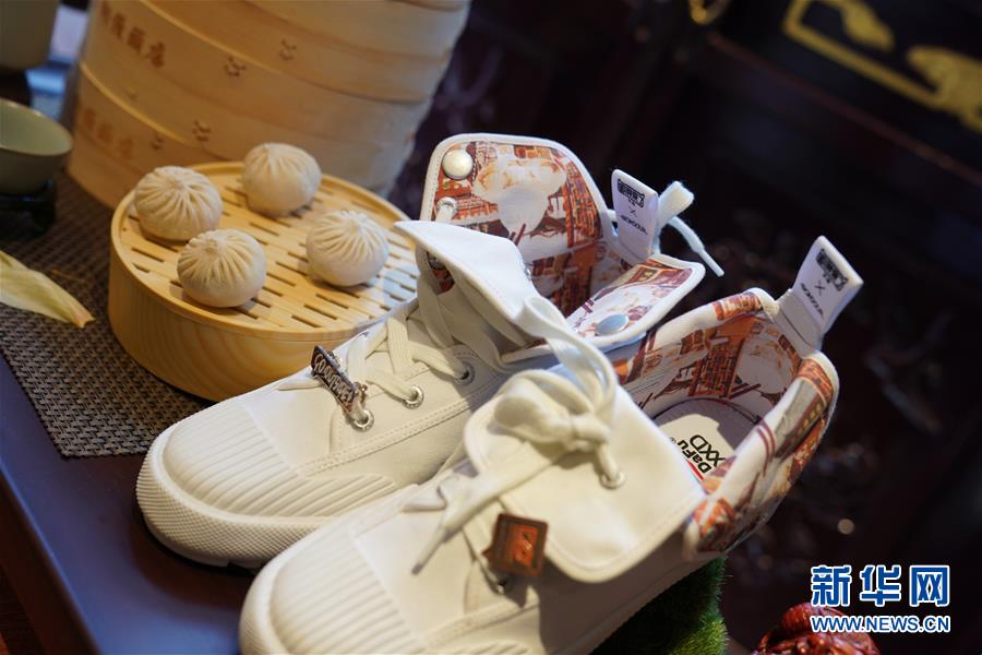上海豫園的南翔饅頭店攜手大孚飛躍發(fā)布的跨界潮鞋,將小籠包圖案印在鞋上(5月12日攝)。新華社記者劉穎攝