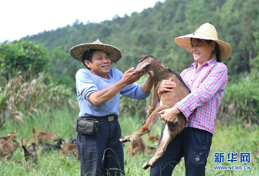 5月13日,在福建省建甌市小橋鎮(zhèn)陽(yáng)澤村,村民呂元鑫(左)和妻子抱起一只小羊。62歲的呂元鑫曾因病返貧,2016年后通過(guò)扶貧貸款從事山羊養(yǎng)殖,現(xiàn)已還清貸款,每年養(yǎng)殖收入兩三萬(wàn)元。新華社記者林善傳攝