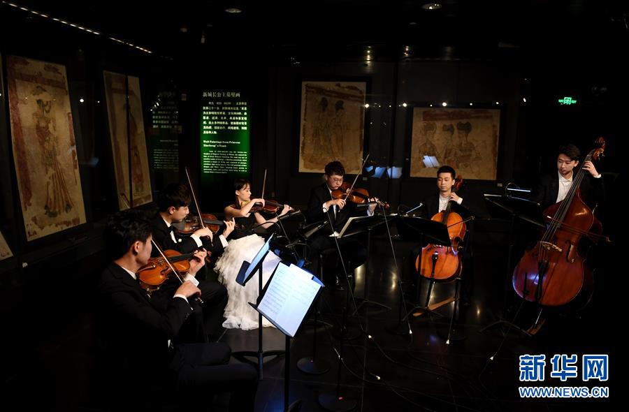 在陜西歷史博物館唐代壁畫(huà)珍品館,西安交響樂(lè)團(tuán)小提琴首席周虎翼、第二小提琴首席白東旭、第二小提琴演奏員葉姣睿、中提琴演奏員時(shí)少愷、大提琴演奏員于丁和低音提琴演奏員趙子杰(從左至右)為“云上國(guó)寶”音樂(lè)會(huì)彩排(5月14日攝)。為迎接國(guó)際博物館日,5月14日,西安交響樂(lè)團(tuán)走進(jìn)陜西歷史博物館唐代壁畫(huà)珍品館,為5月18日的“云上國(guó)寶”音樂(lè)會(huì)彩排。觀眾將通過(guò)網(wǎng)絡(luò)直播,在聆聽(tīng)天籟的同時(shí)欣賞國(guó)之瑰寶,感受藝術(shù)與美的和諧共鳴。新華社記者李一博攝