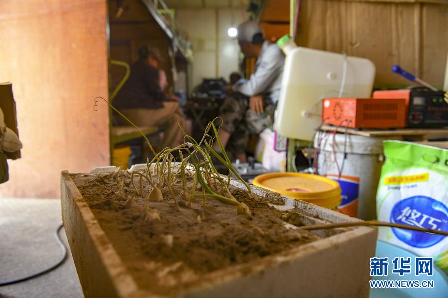 工人在營(yíng)房?jī)?nèi)休息聊天,房?jī)?nèi)一角擺放著他們種植的小蒜苗(5月16日攝)。他們說(shuō),種蒜苗就是為了看看綠色植物。新華社記者胡虎虎攝
