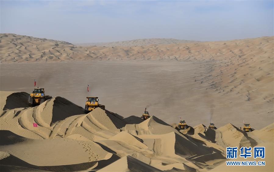 在新疆尉犁至且末沙漠公路施工現(xiàn)場(chǎng),工人駕駛大型推土機(jī)推平沙山(5月16日攝)。新華社記者宋彥樺攝