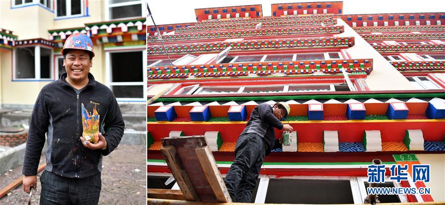 拼版照片:左圖為西藏昌都市卡若區(qū)卡若鎮(zhèn)卡若村村民洛松郎直;右圖為洛松郎直在昌都市一處建筑工地進行外墻彩繪作業(yè)。洛松郎直從小就喜歡畫畫,由于家境貧寒,初中畢業(yè)后,他回到家里干農活、放牧,挑起家庭重擔,但一直沒有放棄畫畫的夢想。后來,洛松郎直前往卡若區(qū)拉多鄉(xiāng)學習唐卡繪畫,技藝得到很大提高。2017年,洛松郎直為卡若區(qū)一個周轉房建設項目繪制墻體彩繪。2018年,在村里的支持下,洛松郎直創(chuàng)辦了公司,承攬更多的藏式墻體彩繪工程(4月30日攝)。新華社記者詹彥攝