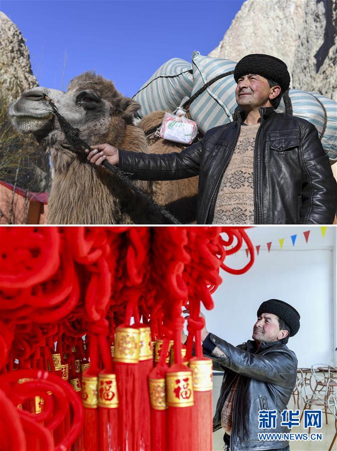 拼版照片上圖:都熱·加爾曼牽著馱有搬遷行李的駱駝走在喀喇昆侖山中(2018年11月17日攝);在塔什庫(kù)爾干塔吉克自治縣塔提庫(kù)力易地扶貧搬遷安置點(diǎn)的衛(wèi)星工廠,都熱·加爾曼在參觀由村民編制的手工藝品,他計(jì)劃讓妻子來(lái)這里上班(2018年11月18日攝)。2018年以來(lái),新疆塔什庫(kù)爾干塔吉克自治縣對(duì)居住在艱苦偏遠(yuǎn)山區(qū)、生產(chǎn)生活資料匱乏、難以實(shí)現(xiàn)就地脫貧的358戶貧困戶,陸續(xù)實(shí)施易地扶貧搬遷,搬遷至距縣城約25公里的塔提庫(kù)力易地扶貧搬遷安置點(diǎn)。安置點(diǎn)還開(kāi)發(fā)了耕地、草場(chǎng),建有衛(wèi)星工廠,確保像都熱一樣的貧困戶能穩(wěn)步增收脫貧。黨的十八大以來(lái),我們堅(jiān)持以人民為中心的發(fā)展思想,明確了到2020年我國(guó)現(xiàn)行標(biāo)準(zhǔn)下農(nóng)村貧困人口實(shí)現(xiàn)脫貧、貧困縣全部摘帽、解決區(qū)域性整體貧困的目標(biāo)任務(wù)。目前看,脫貧進(jìn)度符合預(yù)期,成就舉世矚目。這些成績(jī)的取得,凝聚了全黨全國(guó)各族人民智慧和心血,是廣大干部群眾扎扎實(shí)實(shí)干出來(lái)的。脫貧摘帽不是終點(diǎn),而是新生活、新奮斗的起點(diǎn)。新華社記者胡虎虎攝