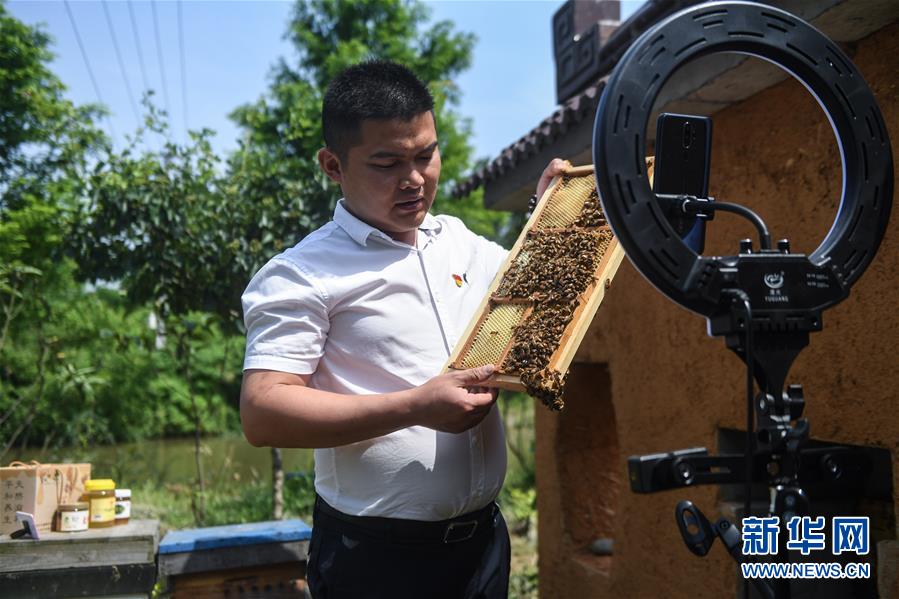 5月20日,長興縣林城鎮(zhèn)畎橋村的意蜂蜂業(yè)幫扶基地內(nèi),養(yǎng)蜂能手邱凱在進(jìn)行網(wǎng)上直播,介紹當(dāng)?shù)孛鄯漯B(yǎng)殖特色及相關(guān)蜂產(chǎn)品。新華社記者徐昱攝