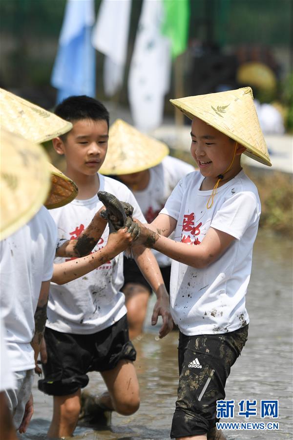 5月24日,小朋友在稻田里捉魚,體驗農(nóng)事。當日,十余名小朋友在家長的帶領(lǐng)下來到浙江省湖州市吳興區(qū)八里店鎮(zhèn)尹家圩糧油植保農(nóng)機專業(yè)合作社的稻田中,參加親子插秧、稻田捉魚等農(nóng)事體驗活動。新華社記者黃宗治攝