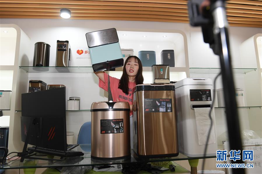 5月25日,在浙江省臺州市黃巖區(qū),一家塑料制品生產(chǎn)企業(yè)的工作人員在直播銷售智能垃圾桶。近年來,浙江省臺州市黃巖區(qū)的家居塑料制品生產(chǎn)企業(yè)加強與國內(nèi)電商平臺的對接,大力開拓線上市場,根據(jù)線上市場反饋,提升產(chǎn)品研發(fā)針對性,創(chuàng)新產(chǎn)品類型,為企業(yè)轉(zhuǎn)型升級注入活力。新華社記者翁忻旸攝