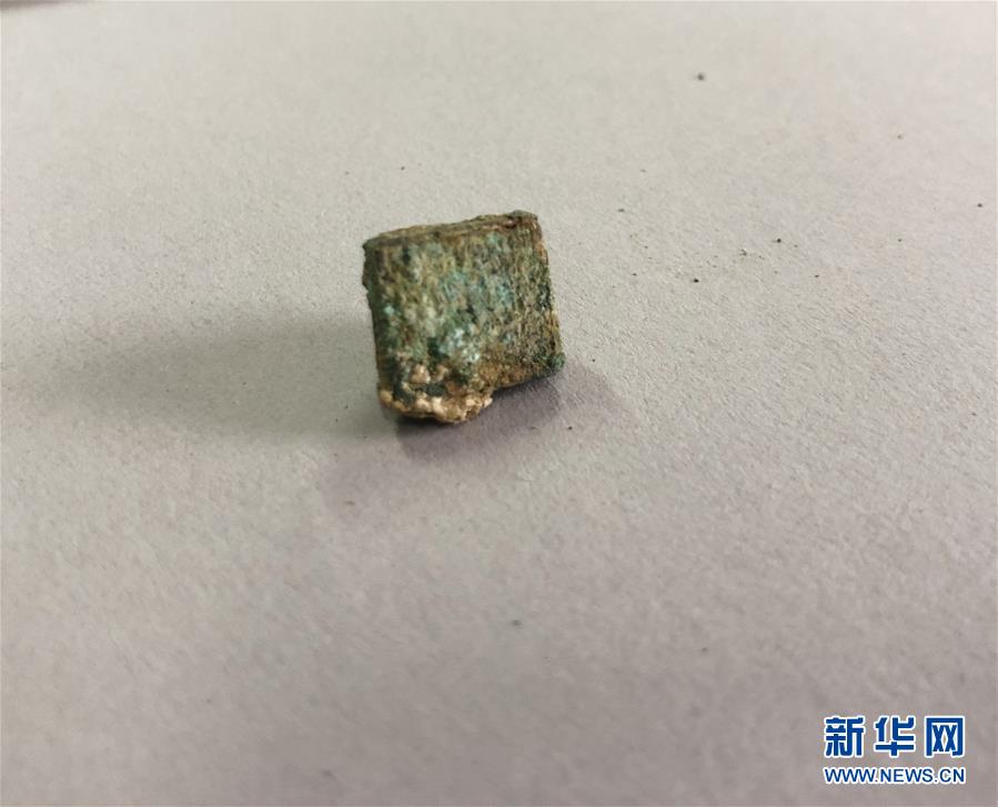 黃河邊大型古墓群出土的一枚隨墓主人下葬的銅印章(5月22日攝)。新華社記者李麗靜攝