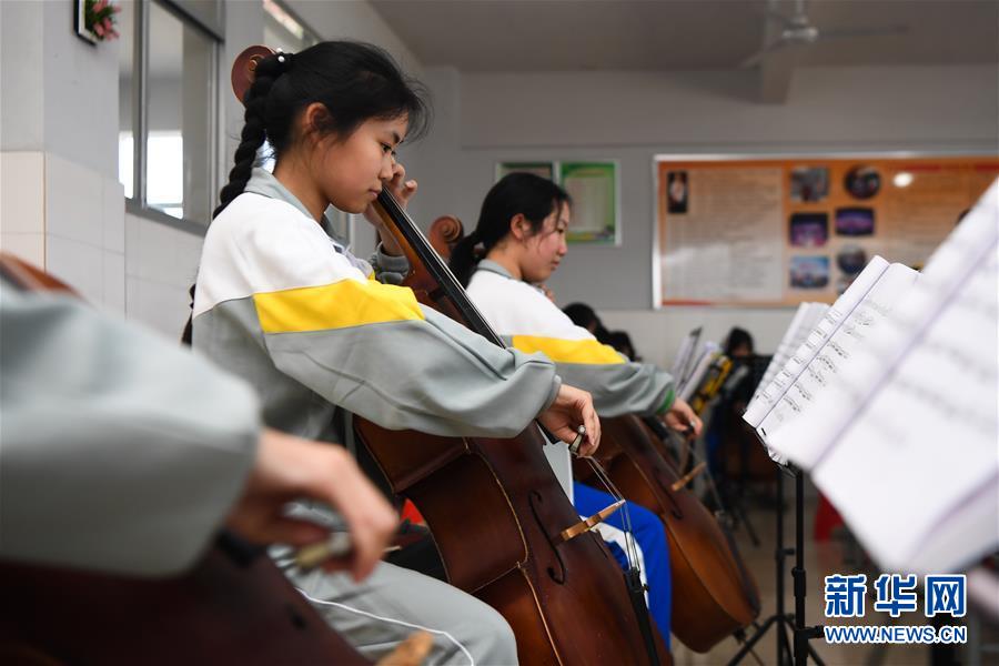 位于湖南省湘西土家族苗族自治州的瀘溪縣第五中學的學生在練習大提琴(5月22日攝)。新華社記者薛宇舸攝