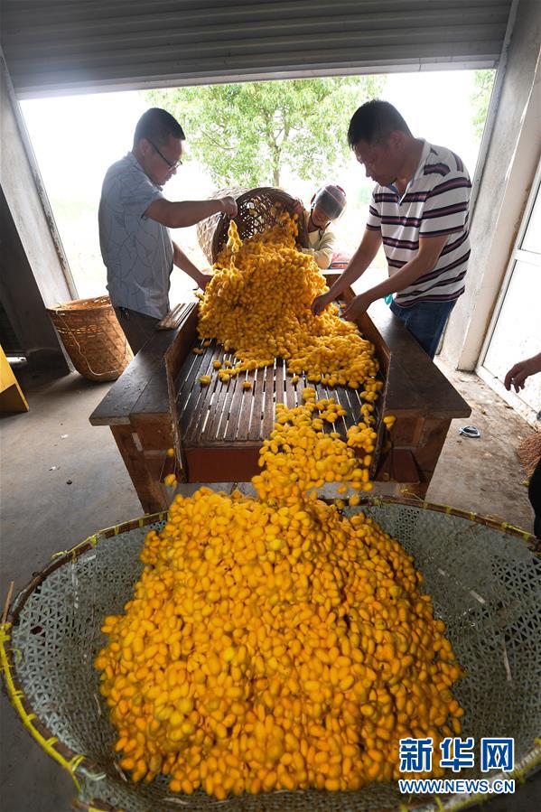 5月27日,桐鄉(xiāng)市鳳鳴街道建勝村70歲的村民宋柏明在收獲“黃金繭”。他今年在桐鄉(xiāng)興民蠶業(yè)專業(yè)合作社的指導下首次養(yǎng)3張黃金蠶繭種,收獲“黃金繭”近400斤,比往年同期增收1500元。近期,蠶桑之鄉(xiāng)浙江省桐鄉(xiāng)市的蠶農(nóng)們迎來了蠶繭豐收的季節(jié),其中新品種“黃金繭”的增收效果尤其明顯。據(jù)介紹,與普通蠶絲相比,色澤金黃的黃金蠶絲中葉黃素含量高,抗菌效果更好,深受市場青睞。2020年春季,浙江省桐鄉(xiāng)市共計發(fā)放黃金蠶繭種1225張,產(chǎn)量預(yù)計75噸,總產(chǎn)值近300萬元,較普通蠶繭增收約20%,成為當?shù)剞r(nóng)業(yè)增收的亮點。浙江省桐鄉(xiāng)市是我國蠶桑的重要產(chǎn)地,“桐鄉(xiāng)蠶桑習俗”也被國務(wù)院列入第二批國家級非物質(zhì)文化遺產(chǎn)名錄。新華社記者徐昱攝