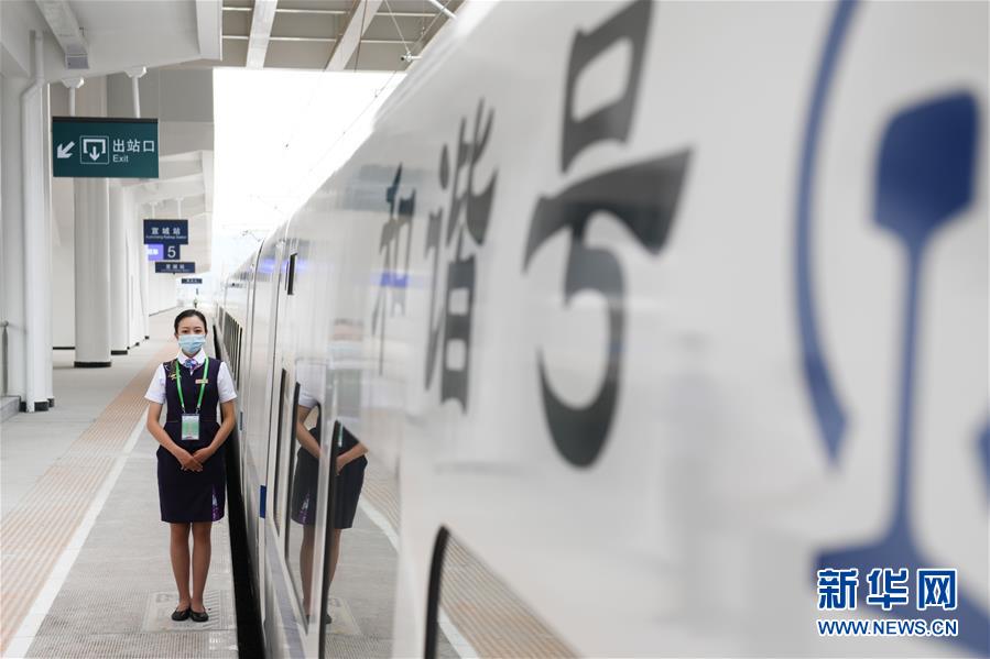 5月27日,試運(yùn)行檢查確認(rèn)列車(chē)乘務(wù)人員在商合杭高鐵宣城站。新華社記者張端攝