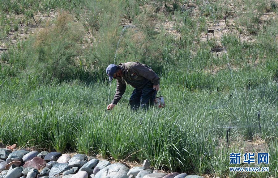 5月28日,工人在巴丹吉林鎮(zhèn)生態(tài)修復(fù)項目南部河道附近修理噴灌設(shè)備,以節(jié)約用水。2017年以來,內(nèi)蒙古阿拉善右旗在巴丹吉林鎮(zhèn)開展生態(tài)修復(fù)項目,種植適合在當(dāng)?shù)厣L的馬蓮、紅柳等植物,修復(fù)生態(tài)的同時也起到美化作用。巴丹吉林鎮(zhèn)是巴丹吉林沙漠旅游景區(qū)的游客集散地,這里常年干旱少雨,水資源匱乏。新華社記者徐欽攝