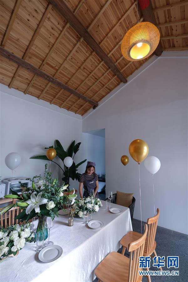 5月28日,湖州市織里鎮(zhèn)廟兜村“三葉屋”民宿工作人員在整理客廳。新華社記者徐昱攝