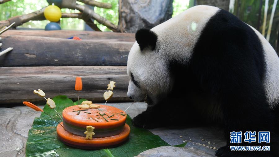 6月1日,大熊貓“舜舜”在品嘗節(jié)日禮物“冰蛋糕”。新華社記者楊冠宇攝