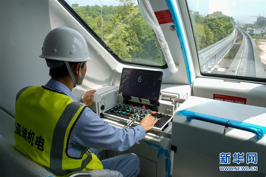 6月3日,工程技術(shù)人員在“云巴”車廂內(nèi)對自動駕駛系統(tǒng)進(jìn)行調(diào)試。近日,重慶市首條“云巴”示范線項(xiàng)目在重慶璧山區(qū)正式亮相。此次發(fā)布的“云巴”采用電能驅(qū)動,具有轉(zhuǎn)彎半徑小、爬坡能力強(qiáng)、噪音低、安全性高、建設(shè)成本低、建造周期短等優(yōu)勢,能為乘客提供更智能、舒適、便捷的出行體驗(yàn)。據(jù)介紹,璧山區(qū)“云巴”示范線項(xiàng)目自2019年8月開建,線路正線全長15.4km,共設(shè)車站15座,預(yù)計(jì)2020年9月全線通車。新華社記者劉潺攝。
