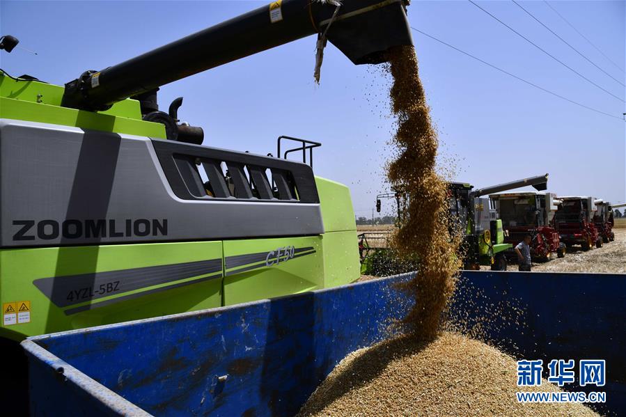 6月3日,在汶上縣郭倉(cāng)鎮(zhèn),收割機(jī)在收獲小麥。目前,我國(guó)第二大小麥主產(chǎn)區(qū)山東6000多萬(wàn)畝小麥進(jìn)入收獲階段。農(nóng)民們搶抓有利天氣,自南向北陸續(xù)開(kāi)鐮。新華社記者郭緒雷攝。