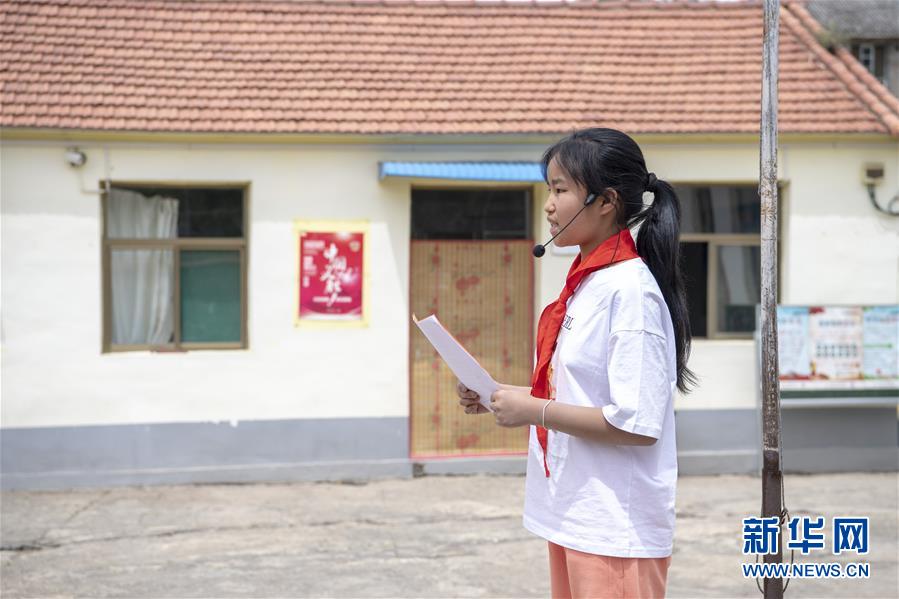 6月2日,秦春蘭在學校的升旗儀式上發(fā)言。新華社記者楊晨光攝。