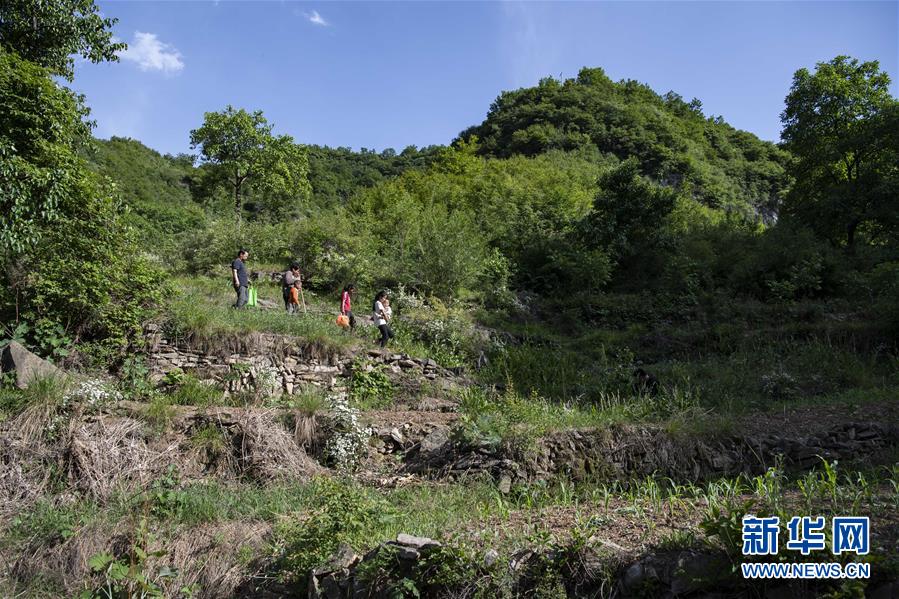 在南背村,秦春蘭(右二)、秦秋蘭(右三)和秦興旺(左三)和老師們走在回家的山路上(5月31日攝)。新華社記者楊晨光攝。