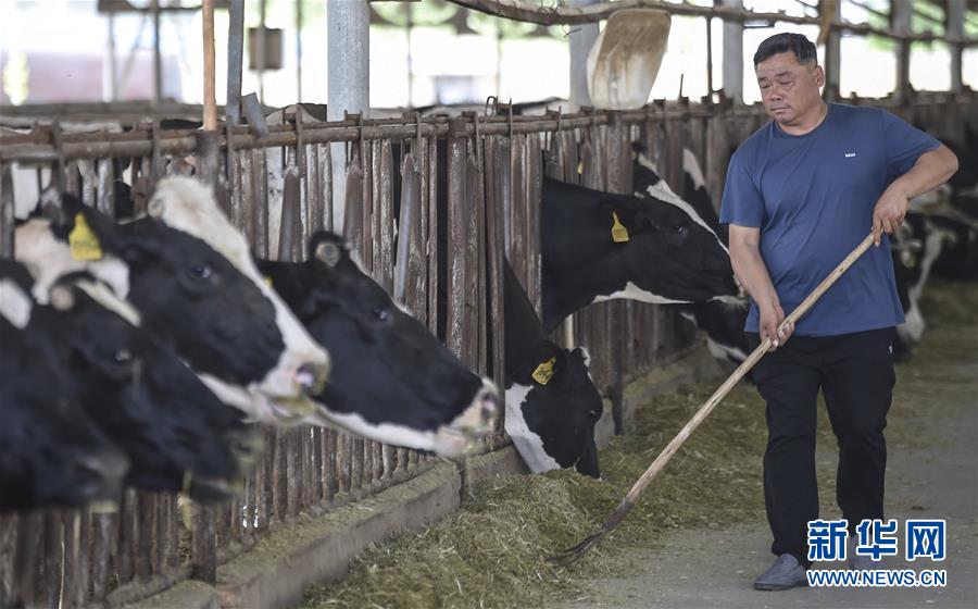 6月3日,村民在深州市榆科鎮(zhèn)郝家莊村奶牛養(yǎng)殖扶貧基地飼喂奶牛。今年以來,河北省深州市圍繞決勝全面小康、決戰(zhàn)脫貧攻堅任務目標,在推進產業(yè)扶貧的過程中注重激發(fā)內生動力,通過電商扶貧、扶貧車間、特色種植養(yǎng)殖等多種形式,提升自我“造血”功能,提高貧困群眾受益度。新華社記者李曉果攝。