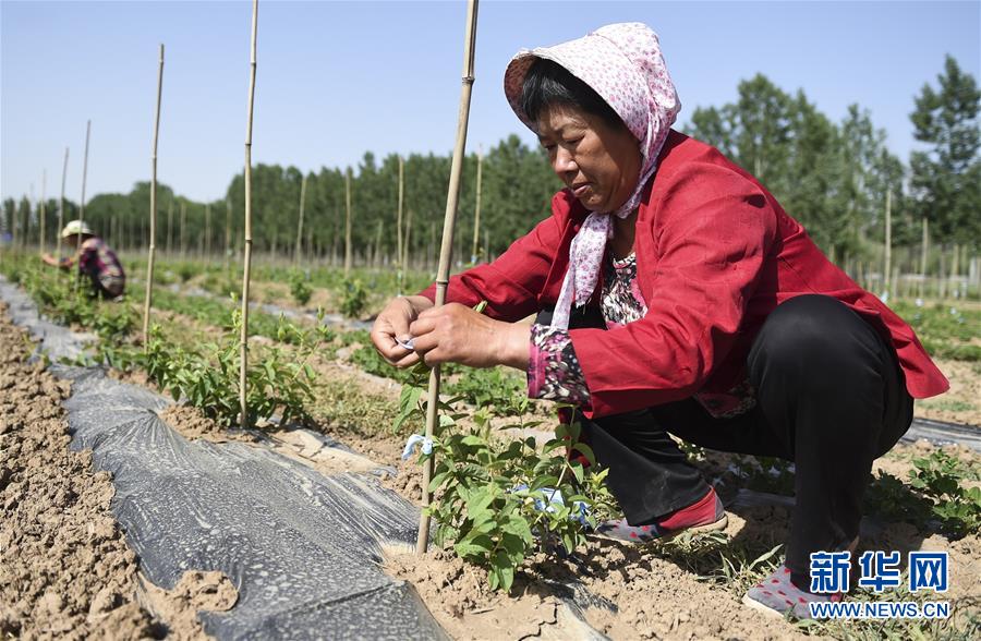 6月3日,村民在深州市魏家橋鎮(zhèn)金銀花種植扶貧基地管理金銀花樹。今年以來,河北省深州市圍繞決勝全面小康、決戰(zhàn)脫貧攻堅任務目標,在推進產業(yè)扶貧的過程中注重激發(fā)內生動力,通過電商扶貧、扶貧車間、特色種植養(yǎng)殖等多種形式,提升自我“造血”功能,提高貧困群眾受益度。新華社記者李曉果攝。