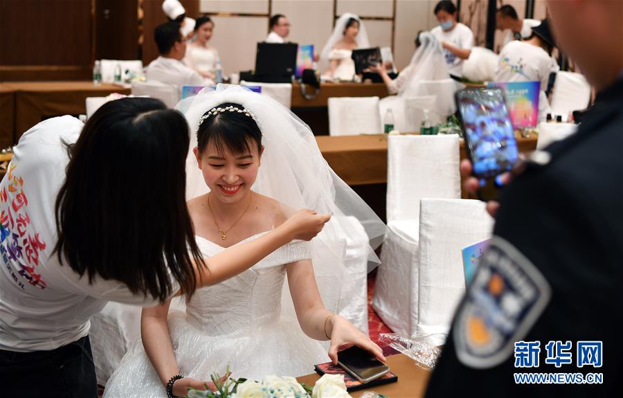 6月6日,海南省萬寧市公安局疫情防控指揮部民警騰凱彪在為正在化妝的妻子侯俊霞拍照。 當(dāng)日,來自全國15個(gè)省份的百對(duì)新人在三亞市亞特蘭蒂斯度假區(qū)舉行了一場特殊的集體婚禮,每對(duì)新人中至少有一位參與過抗擊新冠肺炎疫情的工作。 新華社記者 郭程 攝