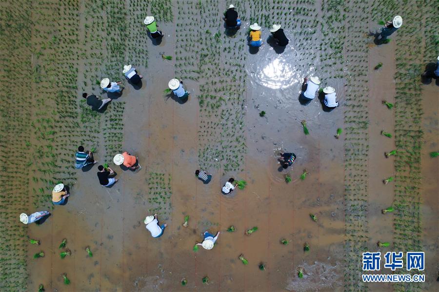 6月7日,孩子和家長們在體驗(yàn)稻田插秧(無人機(jī)照片)。新華社記者徐昱攝