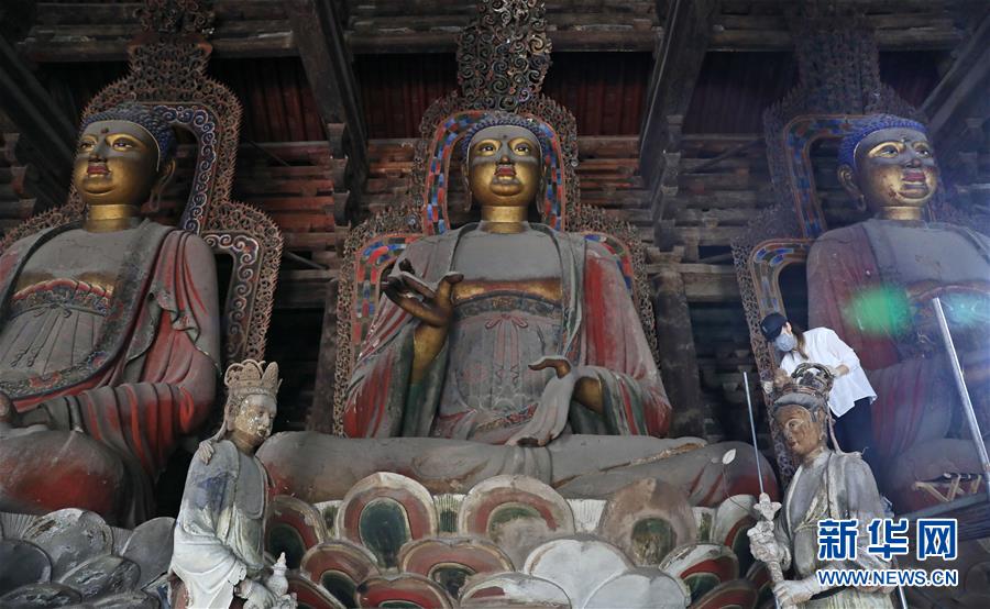 6月8日,工作人員對奉國寺的彩繪泥塑進(jìn)行保護(hù)修復(fù)。新華社記者姚劍鋒攝