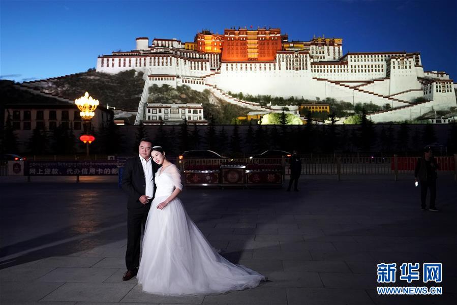 人們在布達(dá)拉宮廣場拍照(6月8日攝)。夜幕降臨,西藏拉薩布達(dá)拉宮燈光璀璨,夜景迷人。新華社記者詹彥攝