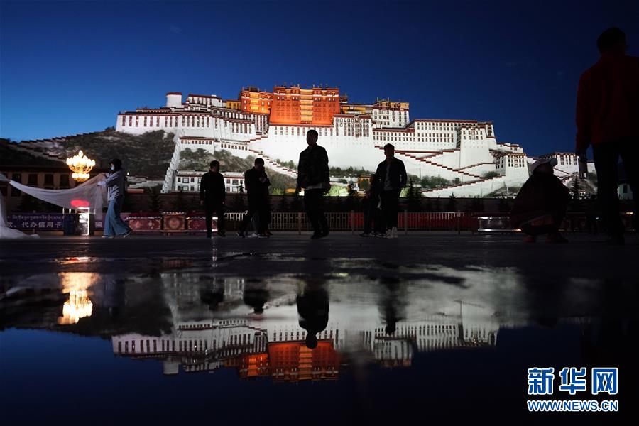 游客在布達(dá)拉宮廣場游覽(6月8日攝)。夜幕降臨,西藏拉薩布達(dá)拉宮燈光璀璨,夜景迷人。新華社記者詹彥攝