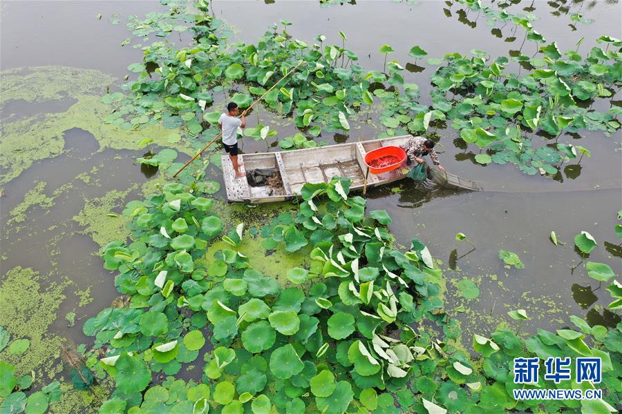 6月9日,在宿遷市宿城區(qū)中揚鎮(zhèn)一家淺水藕套養(yǎng)小龍蝦合作社,負責(zé)人王乃國(右)在取蝦苗(無人機照片)。新華社記者季春鵬攝