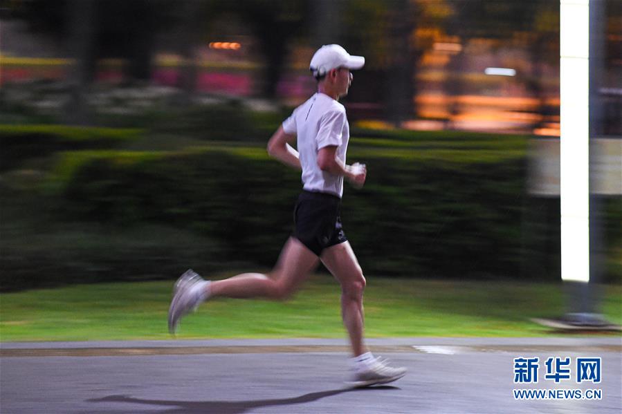 一位市民在??谌f綠園夜跑(5月28日拍攝)。近年來,夜跑成為越來越多都市人熱衷的健身方式之一。在海南???,每當(dāng)夜幕降臨,“夜跑族”來到海口萬綠園、世紀(jì)公園等夜跑場所跑步,用一身酣暢淋漓的汗水?dāng)[脫白天工作中的壓力,享受跑步帶來的歡愉。新華社記者 蒲曉旭 攝