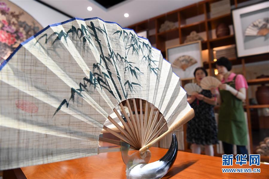 6月12日,非遺傳承人馬仁芬(左)與馬琳沁在探討夏布折扇的創(chuàng)新設(shè)計。新華社記者 唐奕 攝