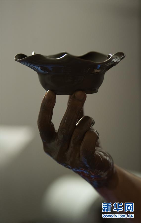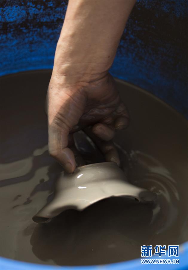 6月17日,在位于浙江慈溪的工作室,聞長慶將一件盞托浸入用本地草木灰調制的釉料中。新華社記者 翁忻旸 攝