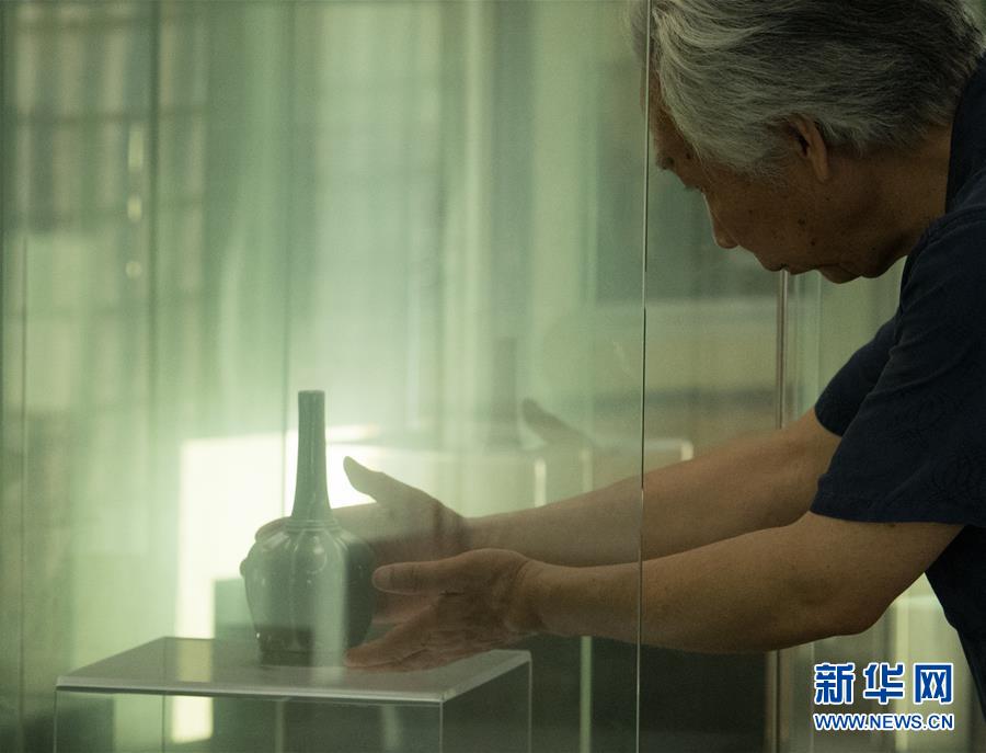 6月17日,在位于浙江慈溪的工作室,聞長(zhǎng)慶從展示柜里拿起一件自己燒制的秘色瓷八棱凈瓶。新華社記者 翁忻旸 攝