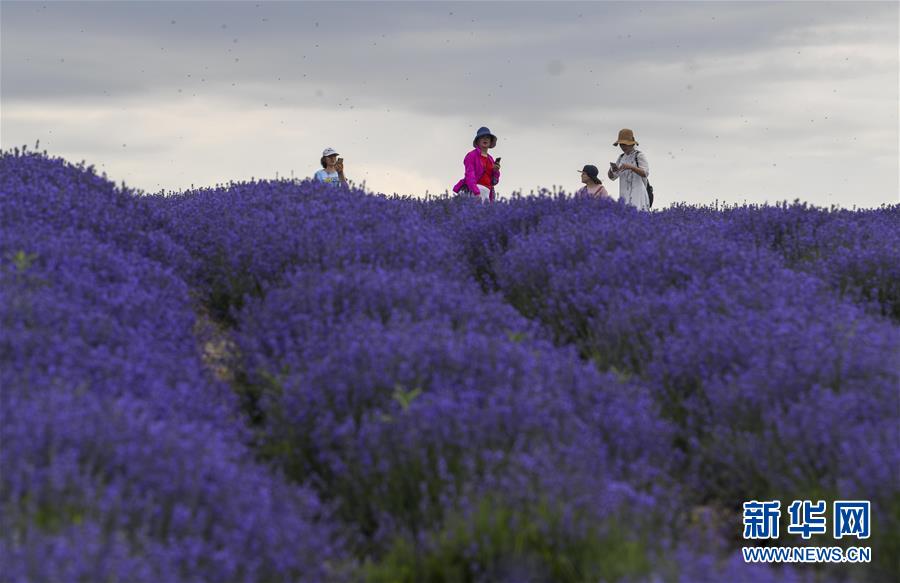 游客在霍城縣蘆草溝鎮(zhèn)四宮村的一處薰衣草花田里游玩(6月16日攝)。新華社記者 趙戈 攝