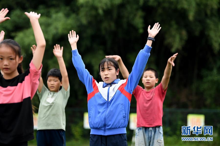 6月19日,在金寨縣三合實驗學(xué)校,蔡齊艷和同學(xué)一起上體育課。新華社記者張端攝