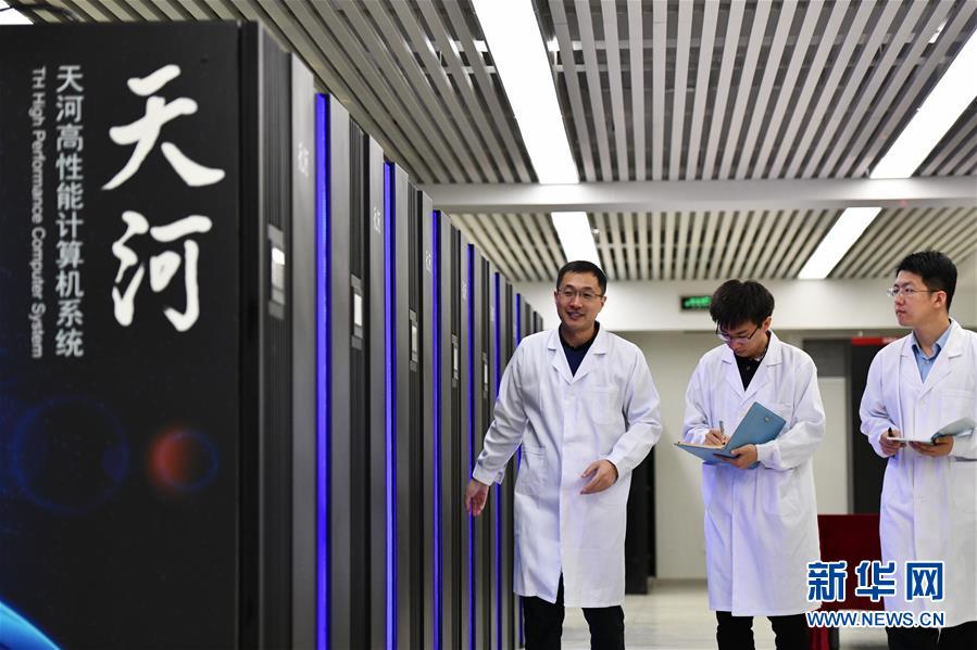 工作人員在國(guó)家超級(jí)計(jì)算天津中心“天河三號(hào)”原型機(jī)機(jī)房?jī)?nèi)巡查(2019年4月24日攝)。新華社記者李然攝