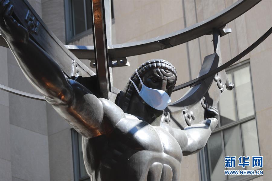 6月22日,在美國紐約洛克菲勒中心,一座雕像被“戴”上口罩。美國約翰斯·霍普金斯大學(xué)22日發(fā)布的新冠疫情最新統(tǒng)計(jì)數(shù)據(jù)顯示,美國累計(jì)死亡病例超過12萬例。新華社記者王迎攝